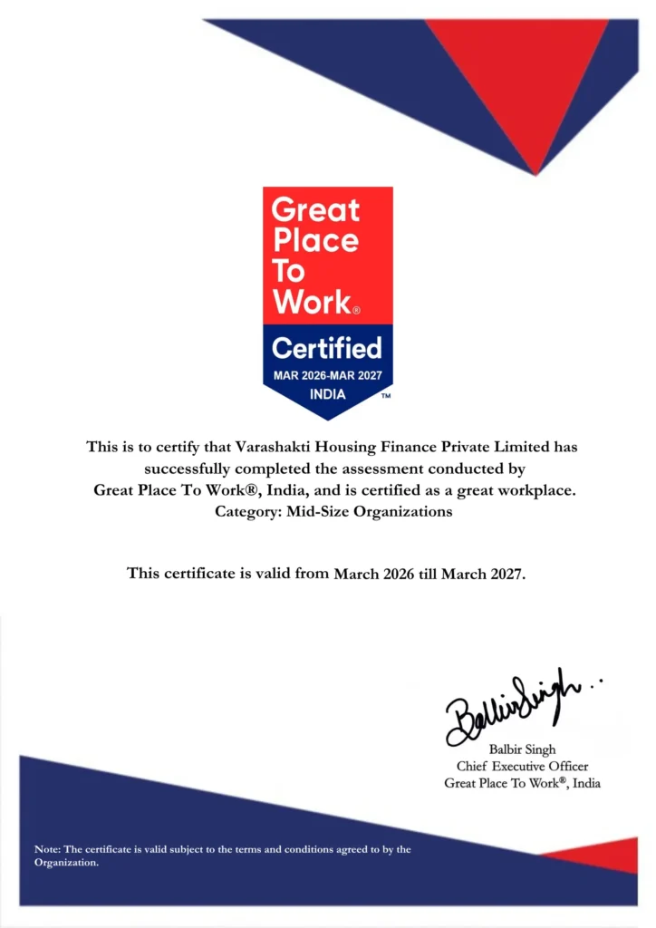 We are delighted to share that Varashakti Housing Finance Private Limited has been certified as a ‘Great Place to Work’. This recognition reflects the strong culture we have built, rooted in our core values of Integrity, Customer-Centricity, Empowerment, Inclusiveness, and Transparency.